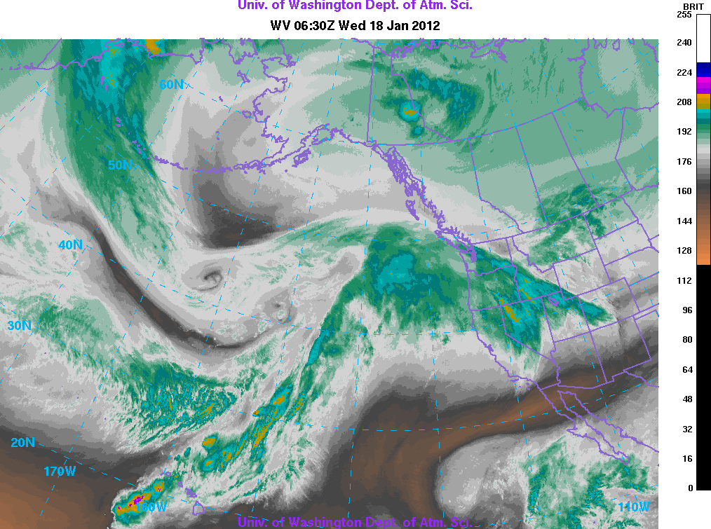 I'm going to show three different images here from different times throughout the day. These images show the water vapor in the atmosphere, which is often more useful than standard infrared satellite maps for picking out centers of low pressure, as low pressure centers tend to develop a "dry slot" right by the low as they develop.